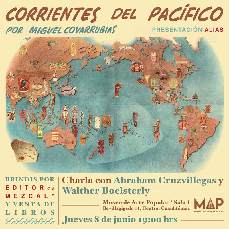 ¡Acompáñennos en esta presentación de Corrientes del Pacífico de Miguel Covarrubias, donde conversaremos con Abraham Cruzvillegas y el maestro Walther Boelsterly Urrutia. La cita es a las 19 hrs en la sala 1 del Museo de Arte Popular, frente al mural Geografía del Arte Popular Mexicano de El Chamaco. El brindis está a cargo de Editor de mezcal