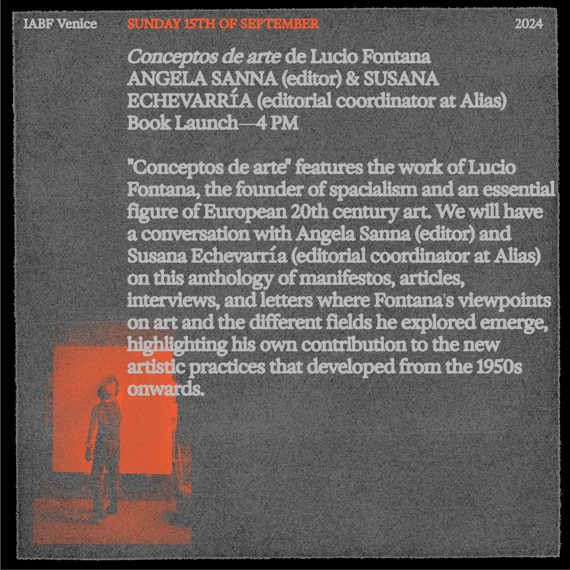 ¡Conceptos de arte se presentará en Venecia! Gracias a la invitación de Index Art Book Fair estaremos presentando la obra de Lucio Fontana en Ca’Buccari el domingo 15 de septiembre a las 16:00 hrs (08:00 hrs en México). Estarán en conversación Angela Sanna, editora de la edición italiana Manifiesti Scritti Interviste (Abscondita, 2020), y Susana Echevarría, coordinadora editorial de la edición empliada en español publicada por Alias.