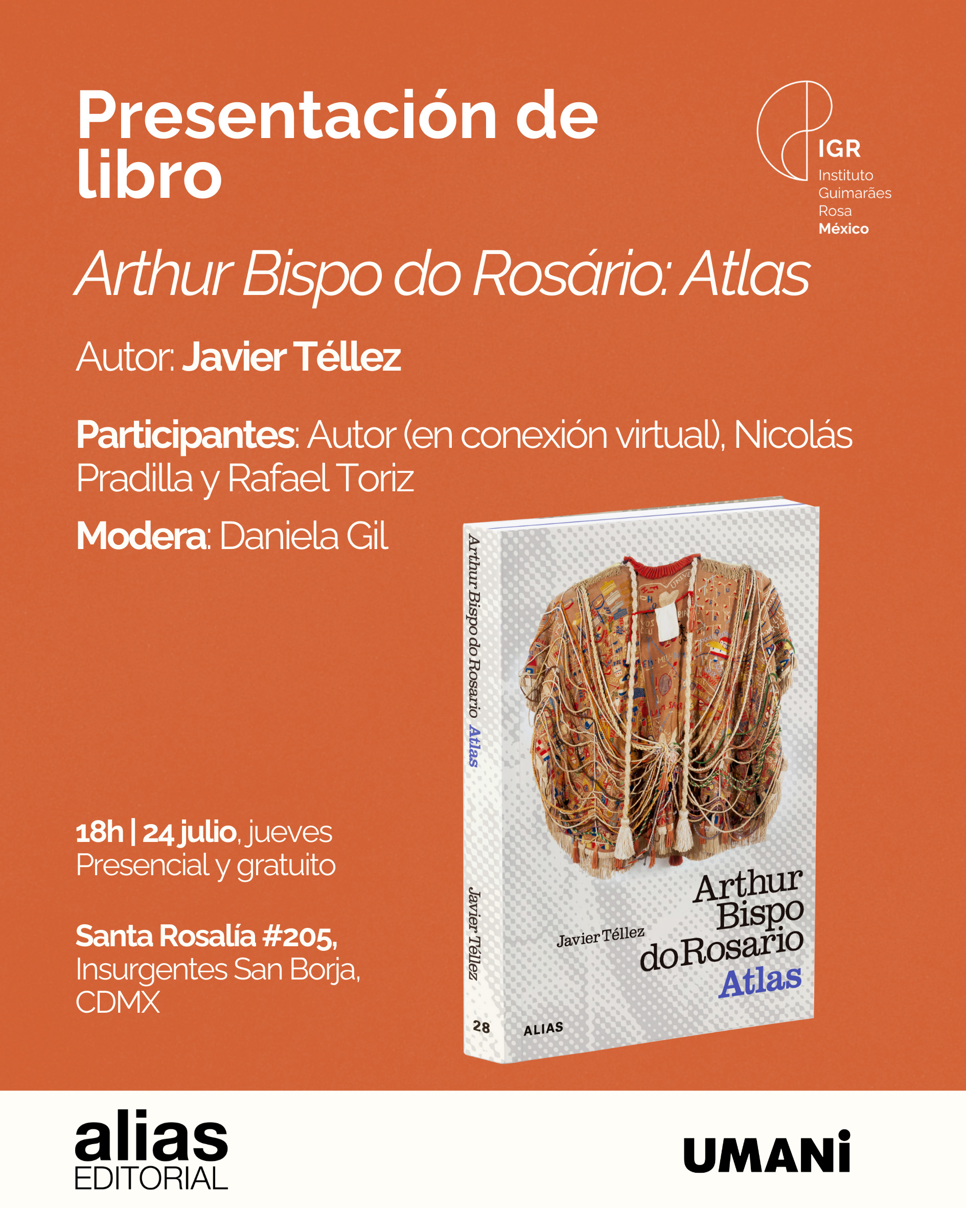 ¡Les invitamos a esta presentación del libro Arthur Bispo do Rosario, Atlas de Javier Téllez! La cita es en la nueva sede del Instituto Guimarães Rosa el jueves 24 de julio a las 18:00 hrs, en compañía del autor (en formato virtual), Nicolás Pradilla y Rafael Toriz.