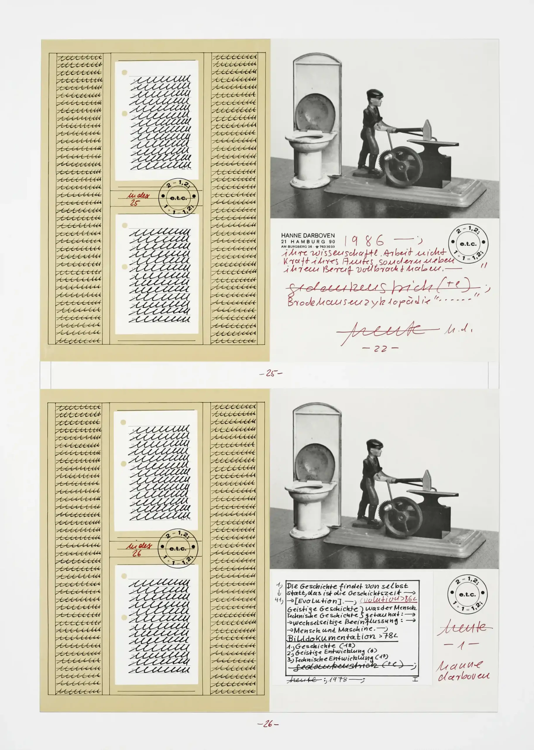 Hanne Darboven (Múnich, 1941 – Hamburgo, 2009) es considerada una de las figuras más importantes del arte alemán de la posguerra, mejor conocida por su arte conceptual y sus instalaciones minimalistas de gran formato. Darboven estudió piano y era aficionada a la ciencia, disciplinas que la llevaron a sentir un interés personal por la acumulación, la inscripción y la repetición, elementos esenciales de su práctica y, particularmente, de su obra monumental Kulturgeschichte 1880-1983 [Historia cultural 1880-1983]. Durante una estadía de dos años en Nueva York, a finales de los años sesenta, Darboven descubrió lo que se convertiría en el proyecto del resto de su vida: la visualización del tiempo en todas sus formas.